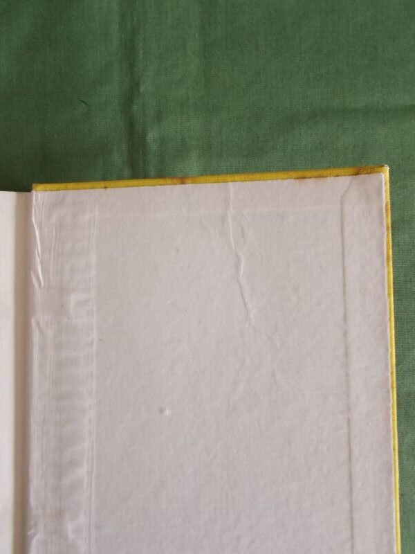 Bumped at head and tail of book spine. The boards are grubby and stained and there is the mark of a cup on the front board. The pastedowns are creased. Minor stain on front end paper getting more and more faint, which runs through to page 13, Light tanning to pages and the page edges are grubby. The photos make the boards look much brighter than they are and are not showing up the staining very well.