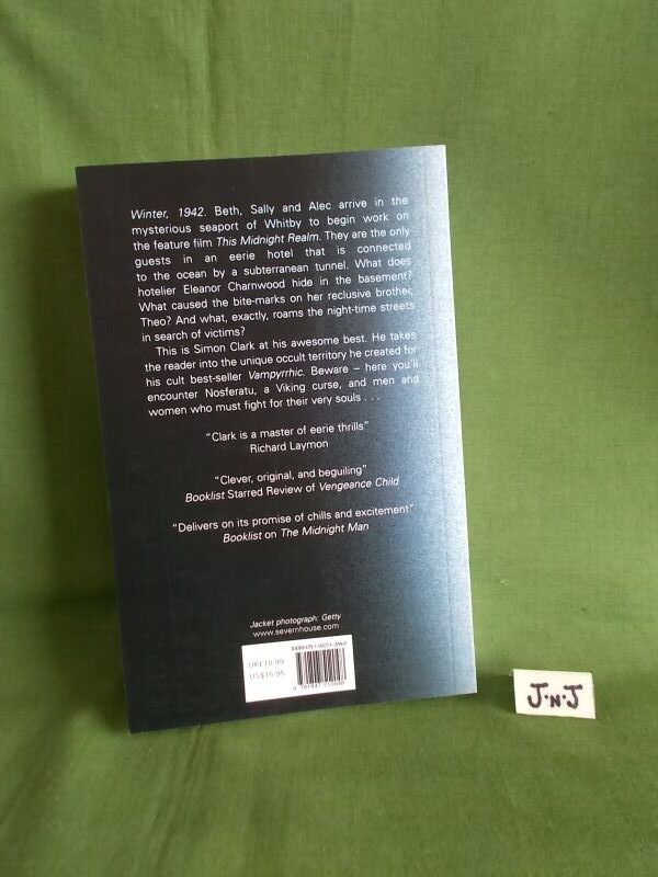 “Winter, 1942. Beth, Sally and Alec arrive in the mysterious seaport of Whitby to begin work on the feature film This Midnight Realm. They are the only guests in an eerie hotel that is connected to the ocean by a subterranean tunnel. What does hotelier Eleanor Charnwood hide in the basement? What caused the bite-marks on her reclusive brother, Theo? And what, exactly roams the night-time streets in search of victims? This is Simon Clark at his awesome best. He takes the reader into the unique occult territory he created for his cult best-seller Vampyrrhic. Beware – here you’ll encounter Nosferatu, a Viking curse, and men and women who must fight for their very souls…”